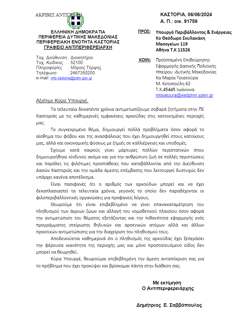 Επιστολή για τις καθημερινές εμφανίσεις της αρκούδας σε κατοικημένες περιοχές της Π.Ε. Καστοριάς, έστειλε ο Αντιπεριφερειάρχης Καστοριάς Δημήτρης Σαββόπουλος, την Πέμπτη 06 Ιουνίου 2024, προς τον Υπουργό Περιβάλλοντος & Ενέργειας Θεόδωρο Σκυλακάκη, κοινοποιώντας τη στην Προϊσταμένη Επιθεώρησης Εφαρμογής Δασικής Πολιτικής Ηπείρου -Δυτικής Μακεδονίας, Μαρία Τσιατούρα.