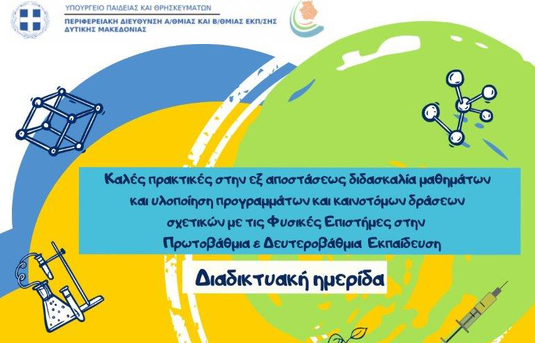 Η Περιφερειακή Διεύθυνση Εκπαίδευσης Δυτικής Μακεδονίας, το ΠΕ.Κ.Ε.Σ. Δυτικής Μακεδονίας, τα Ε.Κ.Φ.Ε. Δυτικής Μακεδονίας, τα Κ.Π.Ε. Δυτικής Μακεδονίας και η ομάδα fb «Εξ αποστάσεως εκπαίδευση» συνδιοργανώνουν διαδικτυακή ημερίδα με τίτλο «Καλές Πρακτικές στην Εξ Αποστάσεως Διδασκαλία Μαθημάτων και Υλοποίηση Προγραμμάτων και Καινοτόμων Δράσεων σχετικών με τις Φυσικές Επιστήμες στην Πρωτοβάθμια & Δευτεροβάθμια Εκπαίδευση» το Σάββατο 15 Μαΐου 2021.