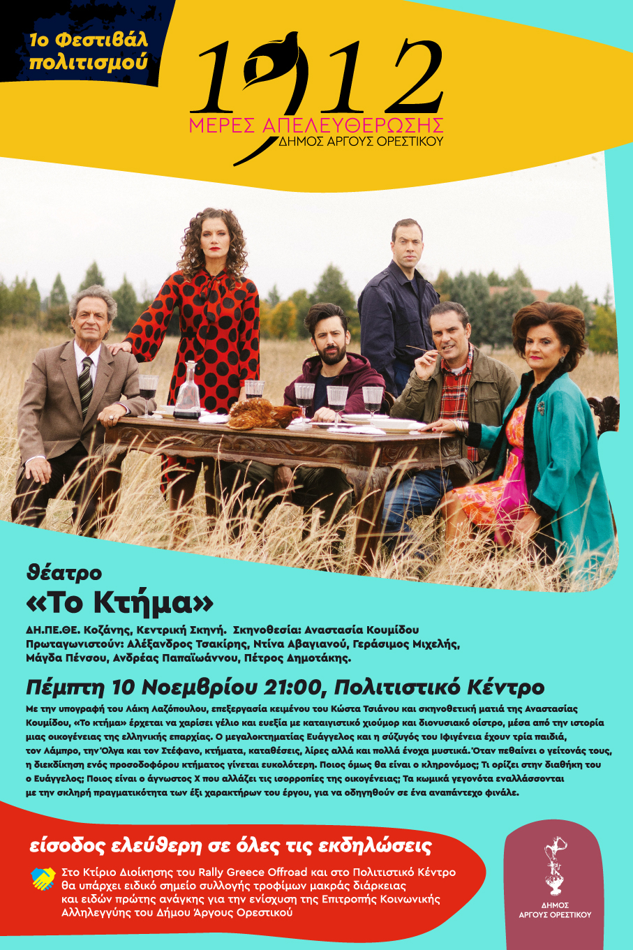 Οι Μέρες Απελευθέρωσης συνεχίζονται σήμερα Πέμπτη 10 Νοεμβρίου στις 21:00 (αυστηρά), στο Πολιτιστικό Κέντρο με την μαύρη κωμωδία του Λάκη Λαζόπουλου, «Το Κτήμα», από την Κεντρική Σκηνή του ΔΗ.ΠΕ.ΘΕ. Κοζάνης.