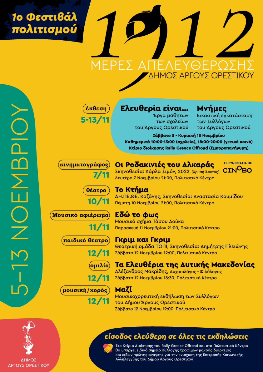 Με μια σειρά ξεχωριστών εκδηλώσεων που περιλαμβάνουν θεατρικές παραστάσεις για μικρούς και μεγάλους, κινηματογραφικές προβολές βραβευμένων ταινιών και ντοκιμαντέρ, ομιλίες, μουσικά αφιερώματα, συνάντηση των Συλλόγων του Δήμου Άργους Ορεστικού αλλά και μια μεγάλη, διπλή, εικαστική έκθεση, ο Δήμος Άργους Ορεστικού συστήνει στο κοινό το 1ο Φεστιβάλ Πολιτισμού «Μέρες Απελευθέρωσης».