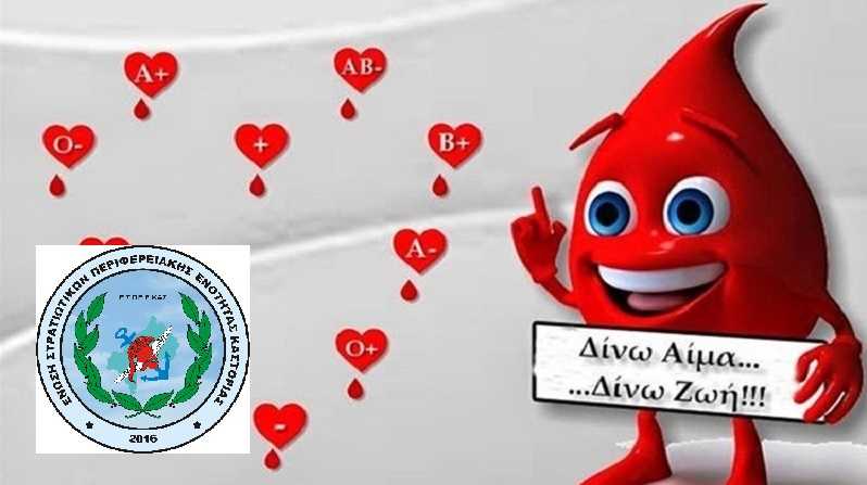 Γνωρίζεται ότι, το Διοικητικό Συμβούλιο της Ένωσής μας, θα πραγματοποιήσει, σε συνεργασία με το Γενικό Νοσοκομείο Καστοριάς αιμοδοσία, την Τρίτη 23 Οκτωβρίου 2018 στο Κέντρο Υγείας  Άργους Ορεστικού και από ώρα 08:30 έως και ώρα 13:00, υπέρ της τράπεζας αίματος που έχει δημιουργήσει η Ένωσή μας με την επωνυμία «Ένωση Στρατιωτικών Περιφερειακής Ενότητας Καστοριάς» και αριθμό μητρώου στο Εθνικό Μητρώο Αιμοδοτών 13961.