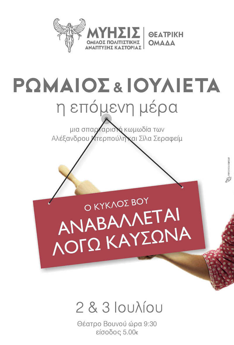 Δυστυχώς η αφόρητη ζέστη που επικρατεί αυτή την περίοδο δε μας επιτρέπει να πραγματοποιήσουμε την παράσταση «Ρωμαίος και Ιουλιέτα, η επόμενη μέρα» που ανακοινώθηκε για τις 2 και 3 Ιουλίου στο Θέατρο Βουνού.