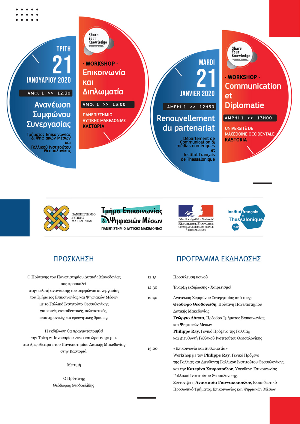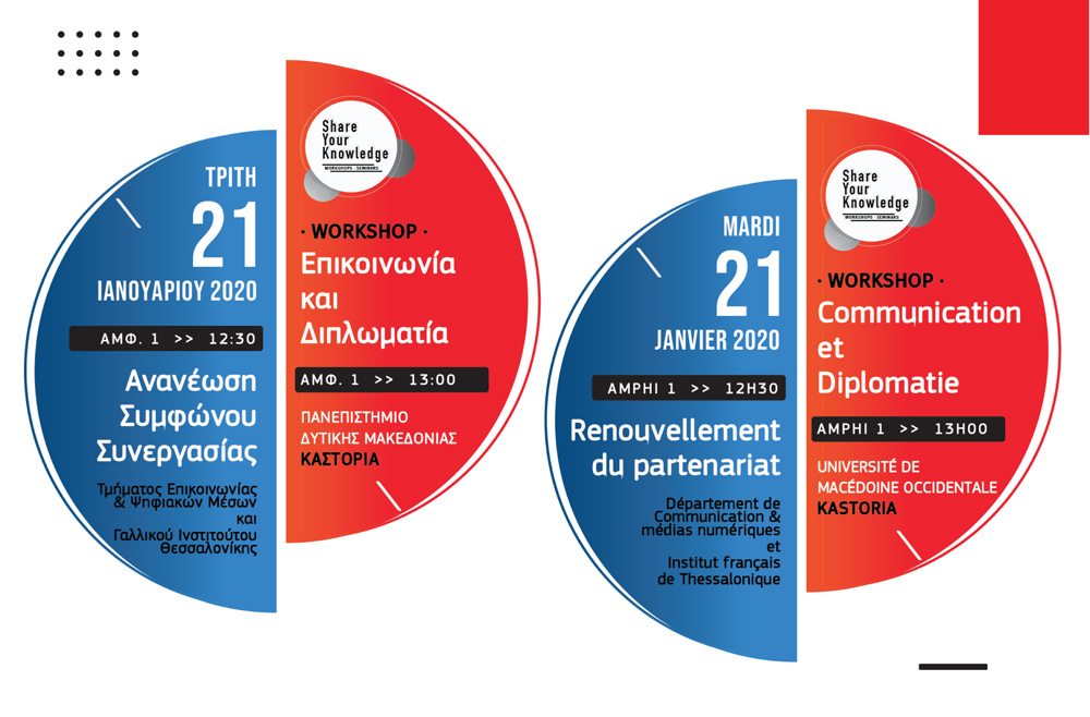 Tην υπογραφή του συμφώνου συνεργασίας θα ακολουθήσει θεματικό εργαστήριο με θέμα: «Επικοινωνία και Διπλωματία» και με ομιλητές τον κ. Philippe Ray, Γενικό Πρόξενο της Γαλλίας και Διευθυντή του Γαλλικού Ινστιτούτου Θεσσαλονίκης, και την κα Κατερίνα Σπυροπούλου, Υπεύθυνη Επικοινωνίας του Γαλλικού Ινστιτούτου Θεσσαλονίκης.
