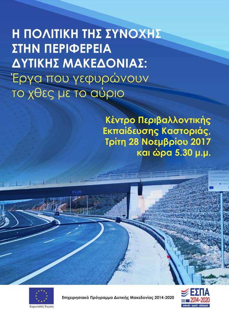 Ανοιχτή ενημερωτική εκδήλωση με θέμα «Η Πολιτική της Συνοχής στην Περιφέρεια Δυτικής Μακεδονίας: Έργα που γεφυρώνουν το χθες με το αύριο» θα πραγματοποιηθεί την Τρίτη 28 Νοεμβρίου 2017 και ώρα 5:30 μμ στην αίθουσα εκδηλώσεων του Κέντρου Περιβαλλοντικής Εκπαίδευσης Καστοριάς (Περιβαλλοντικό Πάρκο Δήμου Καστοριάς δίπλα από το Ενυδρείο).
