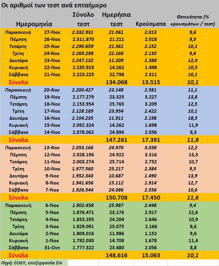Από τα ίδια στοιχεία προκύπτει ότι ο μέσος ημερήσιος αριθμός των τεστ ήταν την εβδομάδα που τελειώνει, 19.153, έναντι 21.037 την αμέσως προηγούμενη, 21.530 στο επταήμερο από 7 μέχρι 13 Νοεμβρίου και 21.231 την πρώτη εβδομάδα του Νοεμβρίου.