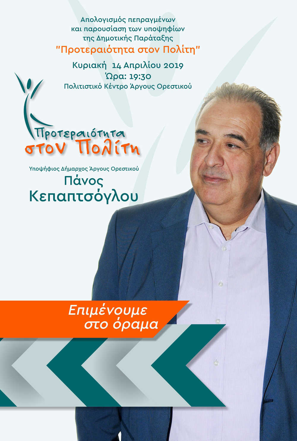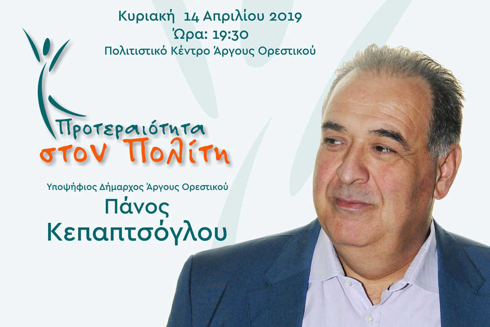 Αύριο το απόγευμα στο Πολιτιστικό Κέντρο του Άργους Ορεστικού, ο Απολογισμός των πεπραγμένων και η παρουσίαση των υποψηφίων Δ.Σ. της Δημοτικής Παράταξης «Προτεραιότητα στον Πολίτη» του υποψ. δημάρχου Άργους Ορεστικού Πάνου Κεπαπτσόγλου