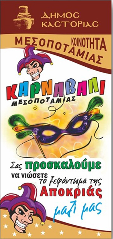 Ο Δήμος Καστοριάς – Αντιδημαρχία Τουρισμού & Πολιτισμού και το Τοπικό Συμβούλιο Κοινότητας Μεσοποταμίας γνωστοποιούν ότι οι δηλώσεις συμμετοχής στο έθιμο της παρέλασης Καρναβαλιού της Κοινότητας Μεσοποταμίας θα υποβάλλονται από Δευτέρα 19 Φεβρουαρίου έως Παρασκευή 15 Μαρτίου στο δημοτικό κατάστημα Μεσοποταμίας.