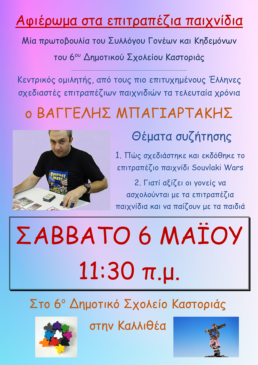 Ο Σύλλογος Γονέων και Κηδεμόνων του 6ου Δημοτικού Σχολείου Καστοριάς, θα πραγματοποιήσει εκδήλωση αφιερωμένη στα επιτραπέζια παιχνίδια. Η εκδήλωση θα γίνει το Σάββατο 6 Μαΐου στις 11:30πμ. Θα έχουμε τη χαρά να βρίσκεται στο Σχολείο μας, ένας από τους πιο επιτυχημένους Έλληνες σχεδιαστές επιτραπέζιων παιχνιδιών τα τελευταία χρόνια, ο Βαγγέλης Μπαγιαρτάκης.