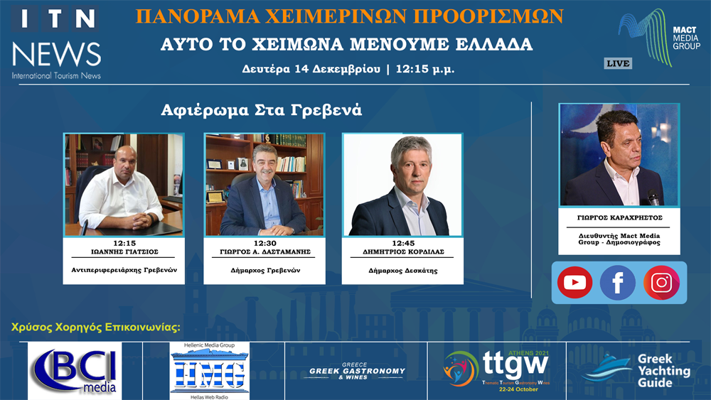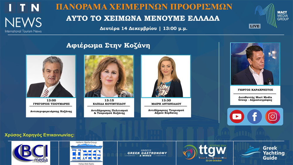 Στις live εκπομπές του itnnews.gr έχουμε την χαρά και την τιμή να σας ανακοινώσουμε ότι την Δευτέρα 14 Δεκεμβρίου 2020 στις 11:30 θα πραγματοποιηθεί εν όψη του Διαδικτυακού Forum «Πανόραμα Χειμερινών Προορισμών στην Ελλάδα» live εκπομπή αφιέρωμα στη Καστοριά , στα Γρεβενά, στη Κοζάνη και στη Καβάλα ITNNEWS .
