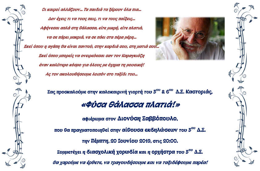 Με μεγάλη επιτυχία πραγματοποιήθηκε το φετινό αφιέρωμα του 5ου& 6ου Δ.Σ. Καστοριάς στον αγαπημένο Διονύση Σαββόπουλο με τίτλο: «Φύσα θάλασσα πλατιά!». Έγιναν γιορτές και στα δύο σχολεία ξεχωριστά και θα πραγματοποιηθεί άλλη μία κοινή, την Πέμπτη 20/6 στις 20:00 στην αίθουσα εκδηλώσεων του 5ου Δ.Σ. για να το χαρούμε ξανά κι εμείς και o κόσμος της πόλης μας.