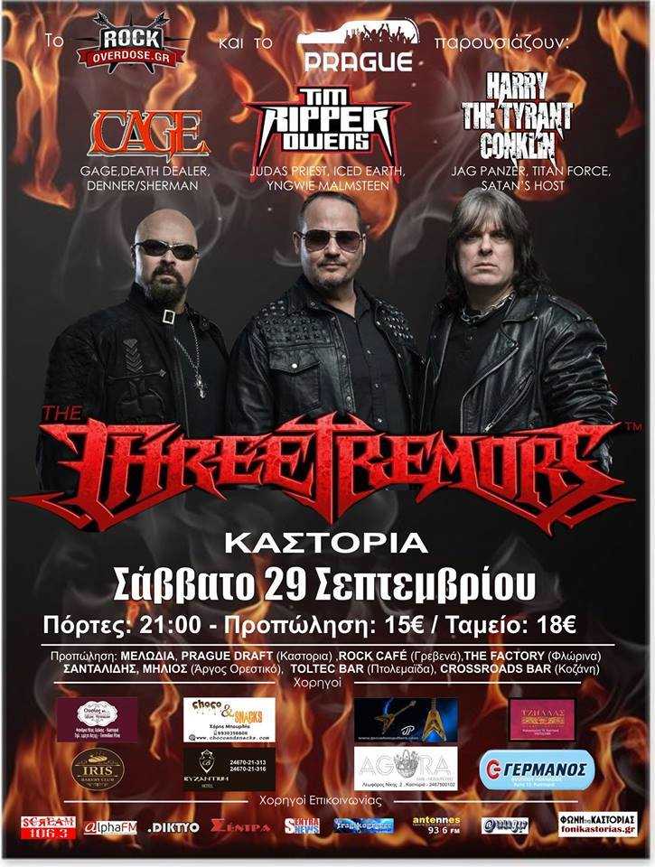 Τρεις μεγάλοι heavy metal τραγουδιστές, ο Tim «The Ripper» Owens (JUDAS PRIEST, ICED EARTH, YNGWIE MALMSTEEN), ο Harry «The Tyrant» Conklin (JAG PANZER, TITAN FORCE) και ο Sean «The Hell Destroyer» Peck (CAGE, DEATH DEALER, DENNER/SHERMANN) ενώνουν τις δυνάμεις τους για ένα καινούργιο project με την ονομασία THE THREE TREMORS και θα επισκεφθούν την ΚΑΣΤΟΡΙΑ, το Σάββατο, 29 Σεπτεμβρίου 2018!
