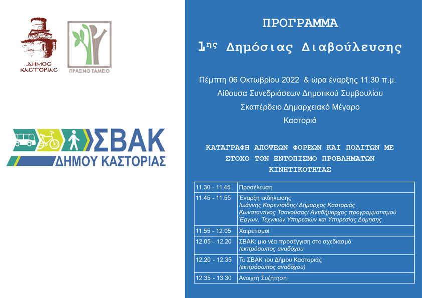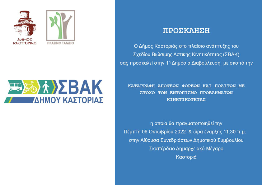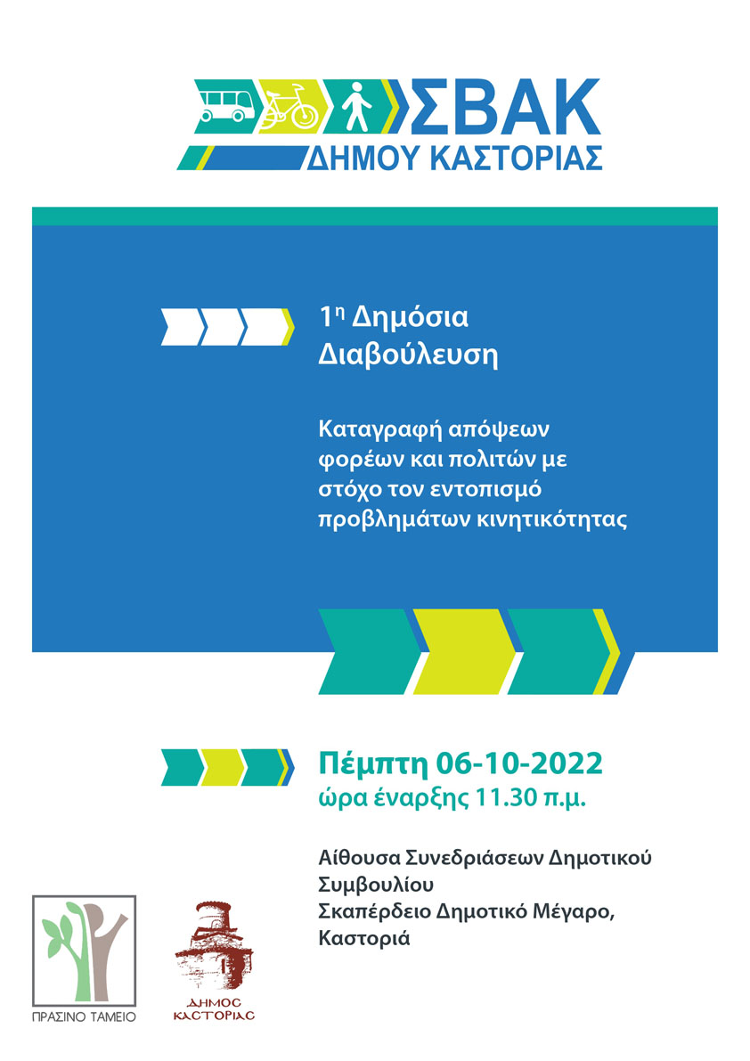 Ο Δήμος Καστοριάς διοργανώνει την 1η Δημόσια Διαβούλευση στο πλαίσιο εκπόνησης του Σχεδίου Βιώσιμης Αστικής Κινητικότητας (ΣΒΑΚ) με σκοπό την καταγραφή απόψεων φορέων και πολιτών με στόχο τον εντοπισμό προβλημάτων κινητικότητας. Η εκδήλωση θα λάβει χώρα, στην Αίθουσα Συνεδριάσεων Δημοτικού Συμβουλίου, στο Σκαπέρδειο Δημαρχειακό Μέγαρο, Καστοριά, την Πέμπτη 06 Οκτωβρίου 2022 και ώρα έναρξης 11.30 π.μ.