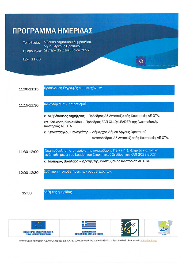 η Αναπτυξιακή Καστοριάς ΑΕ ΟΤΑ σας προσκαλεί σε εκδήλωση διαβούλευσης για την υποβολή πρότασης από την ΑΝΚΑΣ για την επιλογή Στρατηγικών Τοπικής Ανάπτυξης με πρωτοβουλία Τοπικών Κοινοτήτων, στο πλαίσιο της παρέμβασης Π3-77-4.1 «Στήριξη για τοπική ανάπτυξη μέσω του Leader του Στρατηγικού Σχεδίου της ΚΑΠ 2023-2027,