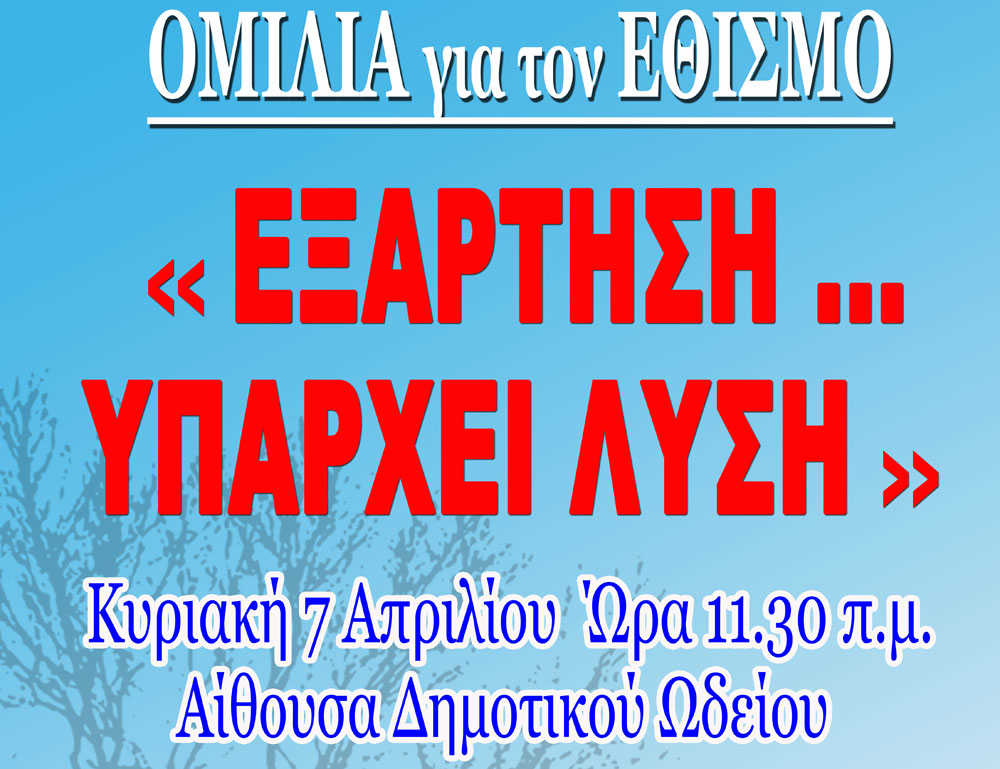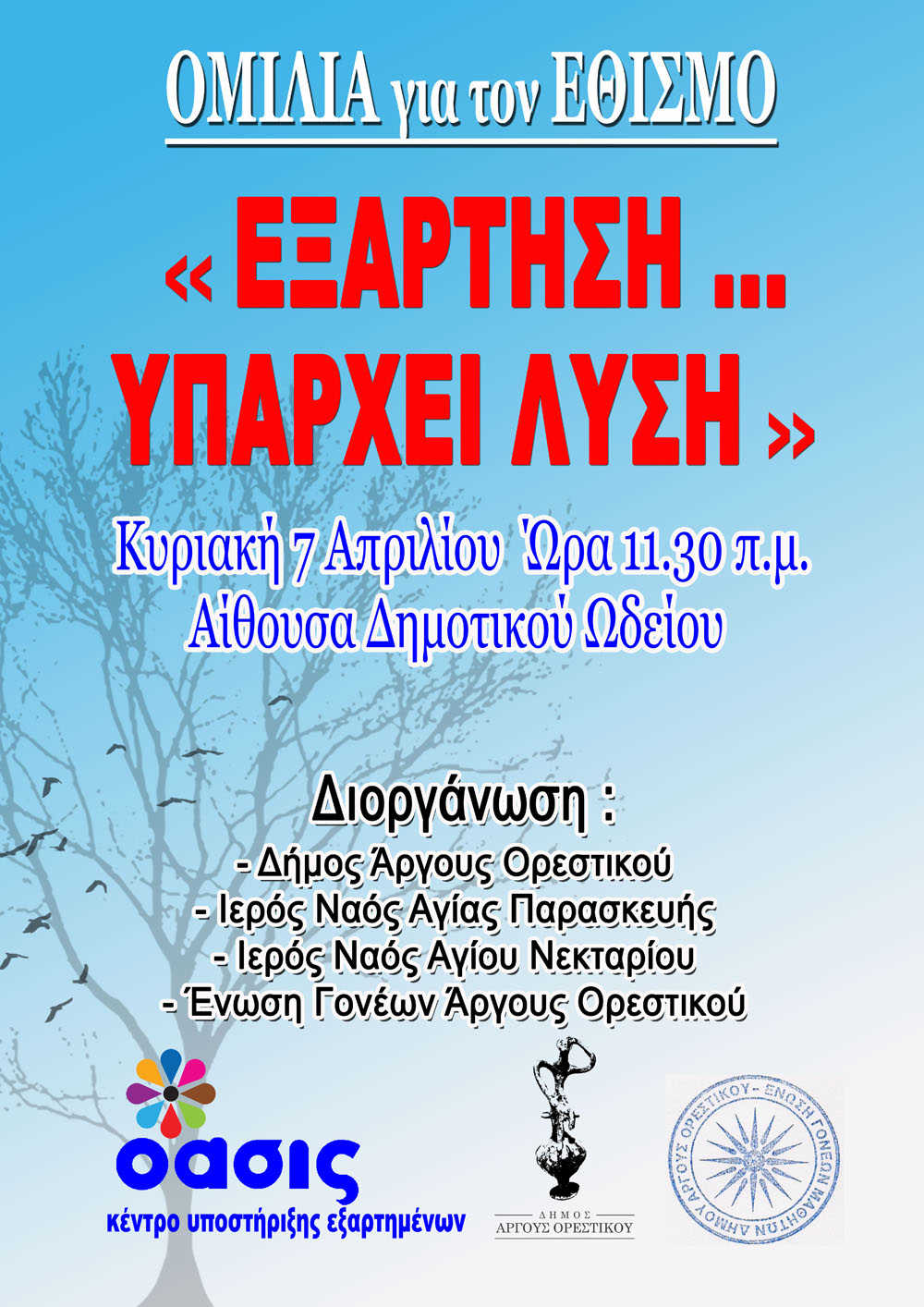 Η «ΟΑΣΙΣ» Κέντρο Υποστήριξης Εξαρτημένων Ατόμων , σε συνεργασία με τον Δήμο Άργους Ορεστικού , τις ενορίες των Ιερών Ναών, Αγίας Παρασκευής και Αγίου Νεκταρίου και την Ένωση Γονέων Άργους Ορεστικού , διοργανώνουν ομιλία με θέμα τον εθισμό : «Στις Εξαρτήσεις … Υπάρχει λύση» που θα πραγματοποιηθεί στην Αίθουσα του Δημοτικού Ωδείου Άργους Ορεστικού την Κυριακή 7 Απριλίου 2019 και ώρα 11.30 π.μ.