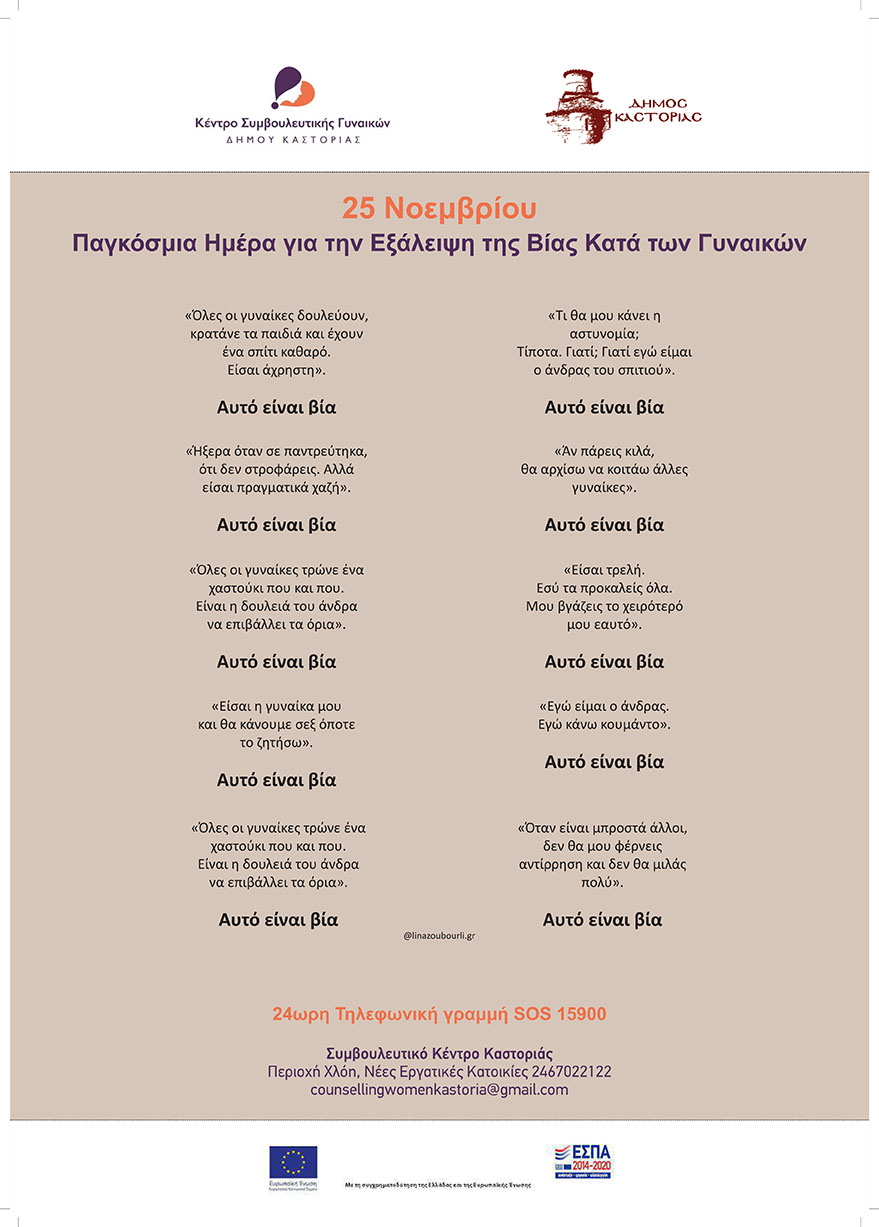 Το Κέντρο Συμβουλευτικής Γυναικών του Δήμου Καστοριάς με αφορμή την 25η Νοεμβρίου «Παγκόσμια Ημέρα για την Εξάλειψη της Βίας Κατά των Γυναικών» θα συμμετέχει και θα πραγματοποιήσει δράσεις ευαισθητοποίησης και ενημέρωσης.