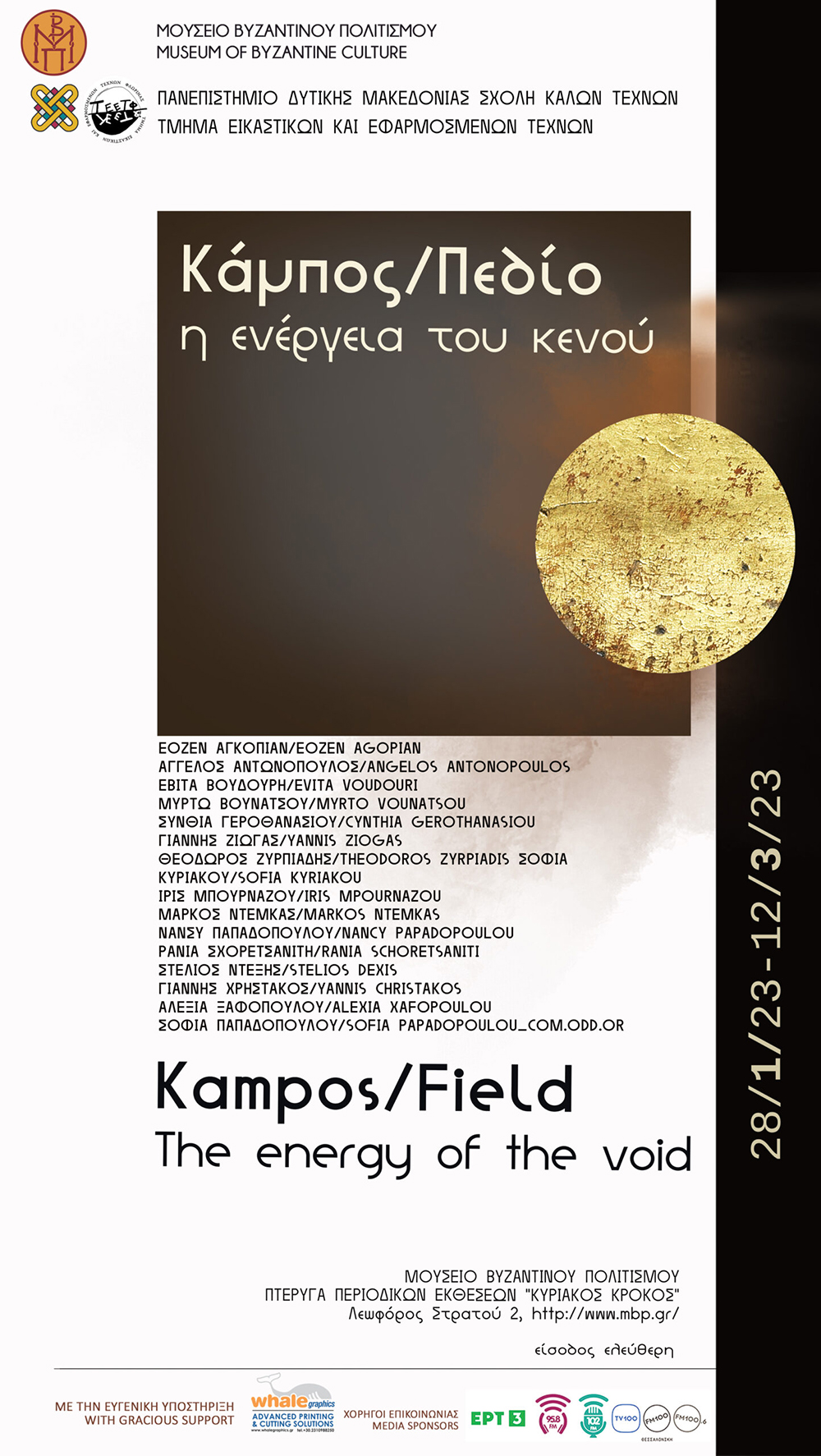 To Μουσείο Βυζαντινού Πολιτισμού Θεσσαλονίκης σε συνεργασία με το Τμήμα Εικαστικών και Εφαρμοσμένων Τεχνών της Σχολής Καλών Τεχνών του Πανεπιστημίου Δυτικής Μακεδονίας σας προσκαλούν στα εγκαίνια της έκθεσης «Κάμπος/Πεδίο: η ενέργεια του κενού» το Σάββατο 28 Ιανουαρίου 2023 στις 18:00 στην πτέρυγα περιοδικών εκθέσεων του Μουσείου Βυζαντινού Πολιτισμού «Κυριάκος Κρόκος».