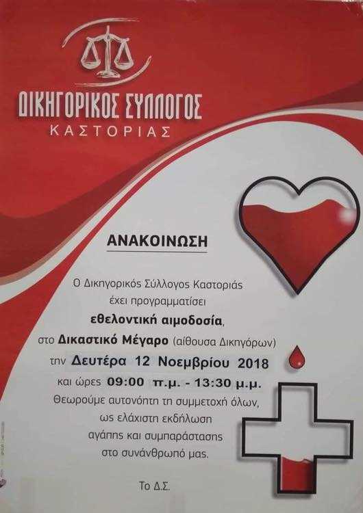 Εθελοντική αιμοδοσία θα πραγματοποιήσει την Δευτέρα 12 Νοεμβρίου, ο Δικηγορικός Σύλλογος Καστοριάς.