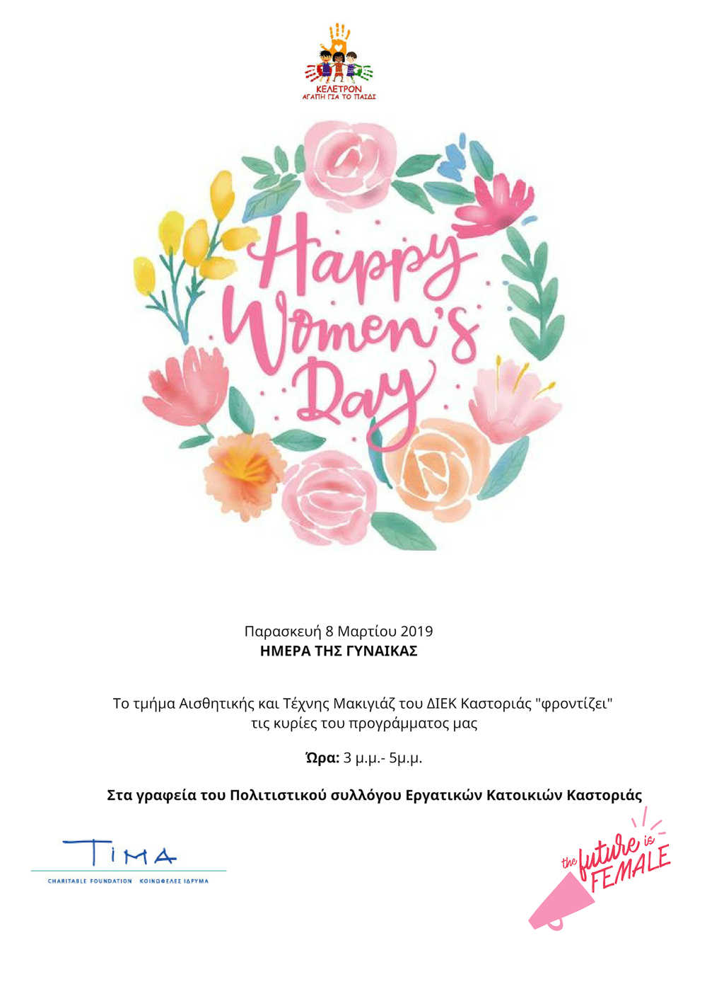 Την Παρασκευή 8 Μαρτίου 2019,Ημέρα της Γυναίκας, στις 3:00-5:00 μ.μ., στα γραφεία του Πολιτιστικού συλλόγου Εργατικών Κατοικιών Καστοριάς,σε συνεργασία με το Τμήμα Αισθητικής και Τέχνης Μακιγιάζ του ΔΙΕΚ Καστοριάς «φροντίζουμε» τις κυρίες του προγράμματος «Φροντίδα για την τρίτη Ηλικία».