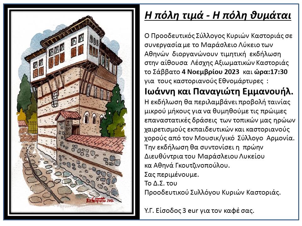 Καλούμε όλους τους καστοριανούς συντοπίτες μας να παρευρεθούν στην τιμητική εκδήλωσή μας, το Σάββατο 4 Νοεμβρίου και ώρα 5:30 στην λέσχη Αξιωματικών Καστοριάς ,που θα συνοδεύεται με καφέ, κεράσματα και μουσική από τον DJ Γιάννη Σταύρου.
