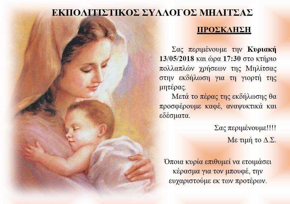 Την Κυριακή 13 Μαΐου, ο Εκπολιτιστικός Σύλλογος Μηλίτσας, θα πραγματοποιήσει εκδήλωση για τη γιορτή της μητέρας.