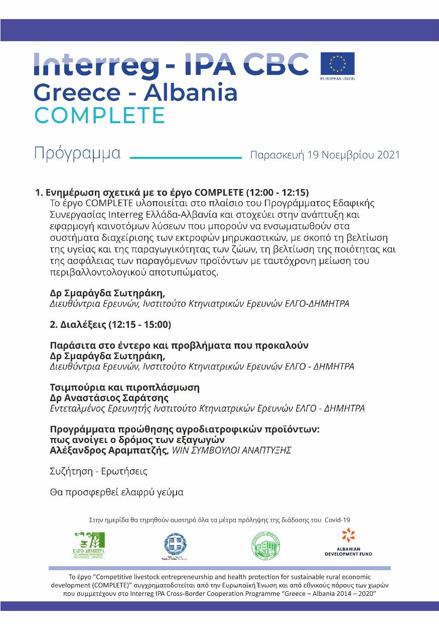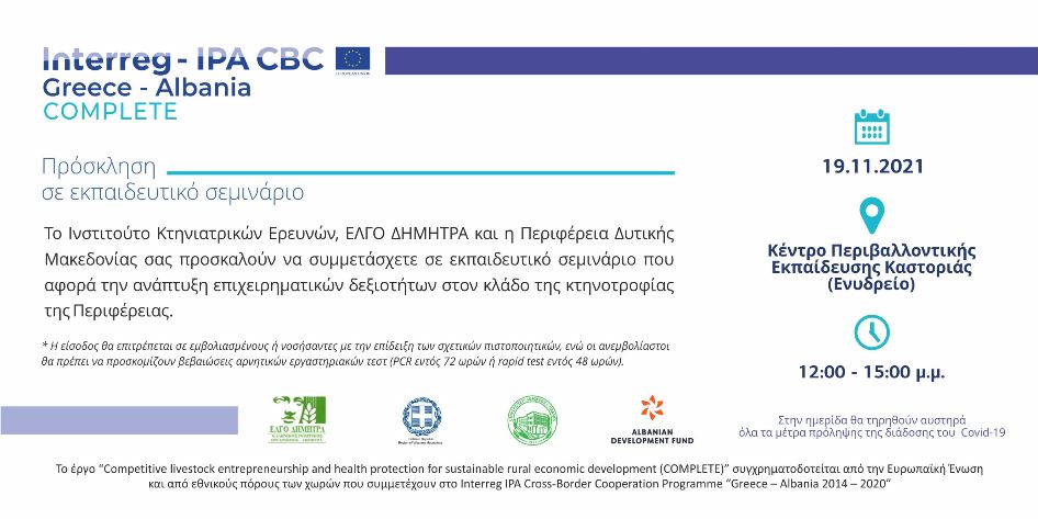 Tο Ινστιτούτο Κτηνιατρικών Ερευνών ΕΛΓΟ Δήμητρα και η Περιφέρεια Δυτικής Μακεδονίας σας προσκαλούν να συμμετάσχετε σε εκπαιδευτικό σεμινάριο  που αφορά την ανάπτυξη επιχειρηματικών δεξιοτήτων στον κλάδο της Κτηνοτροφίας της Περιφέρειας.