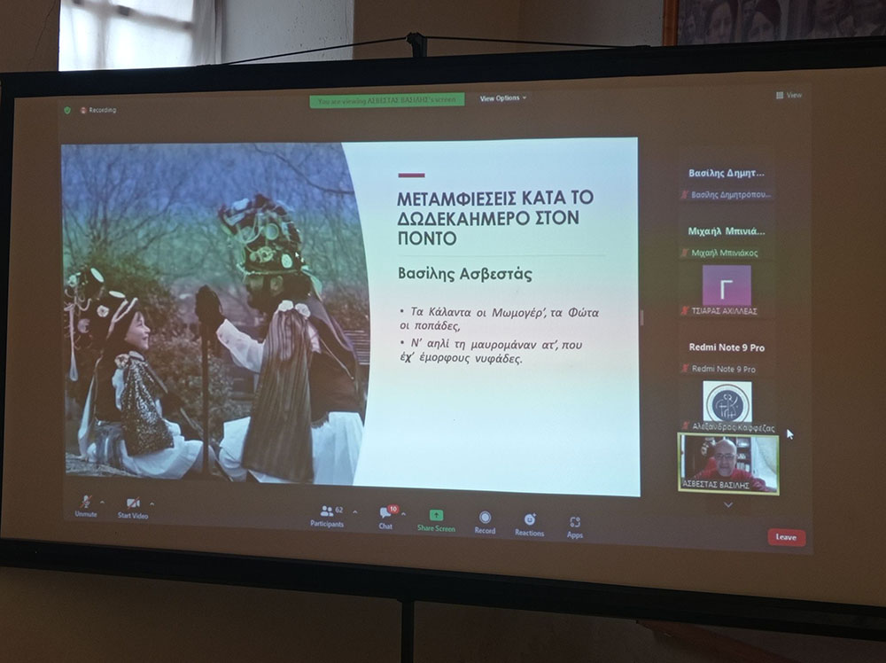 Ακολούθησαν, η Μαρία Κιάκου, η οποία παρουσίασε τους αράπηδες από τα χωριά της Δράμας, ο Αχιλλέας Τσιάρας, που παρουσίασε τα ρουγκάτσια της περιοχής Ρουμλουκίου και ο Βασίλης Ασβεστάς, τους μωμο (γ) ερους του Πόντου.