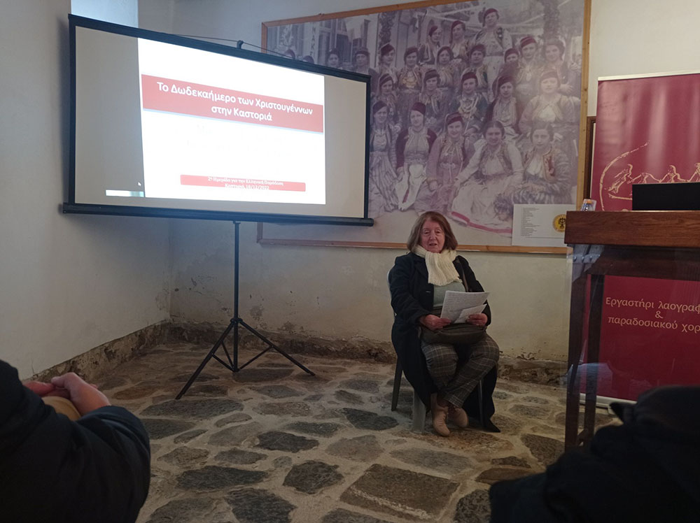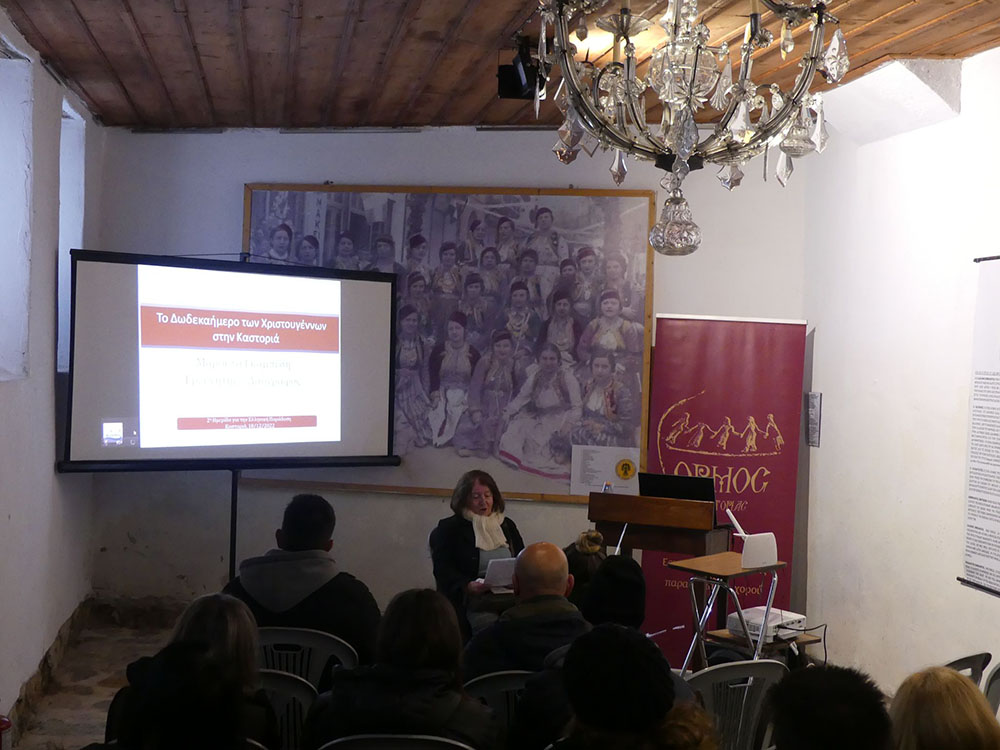 Στο αρχοντικό των Αφών Εμμανουήλ στο Ντουλτσό, η ημερίδα ξεκίνησε με την κ. Μαρούλα Γκαμπέση που μετέφερε μοναδικά εικόνες από την τέλεση των εθίμων της Καστοριάς σε διαφορετικές χρονικές στιγμές.