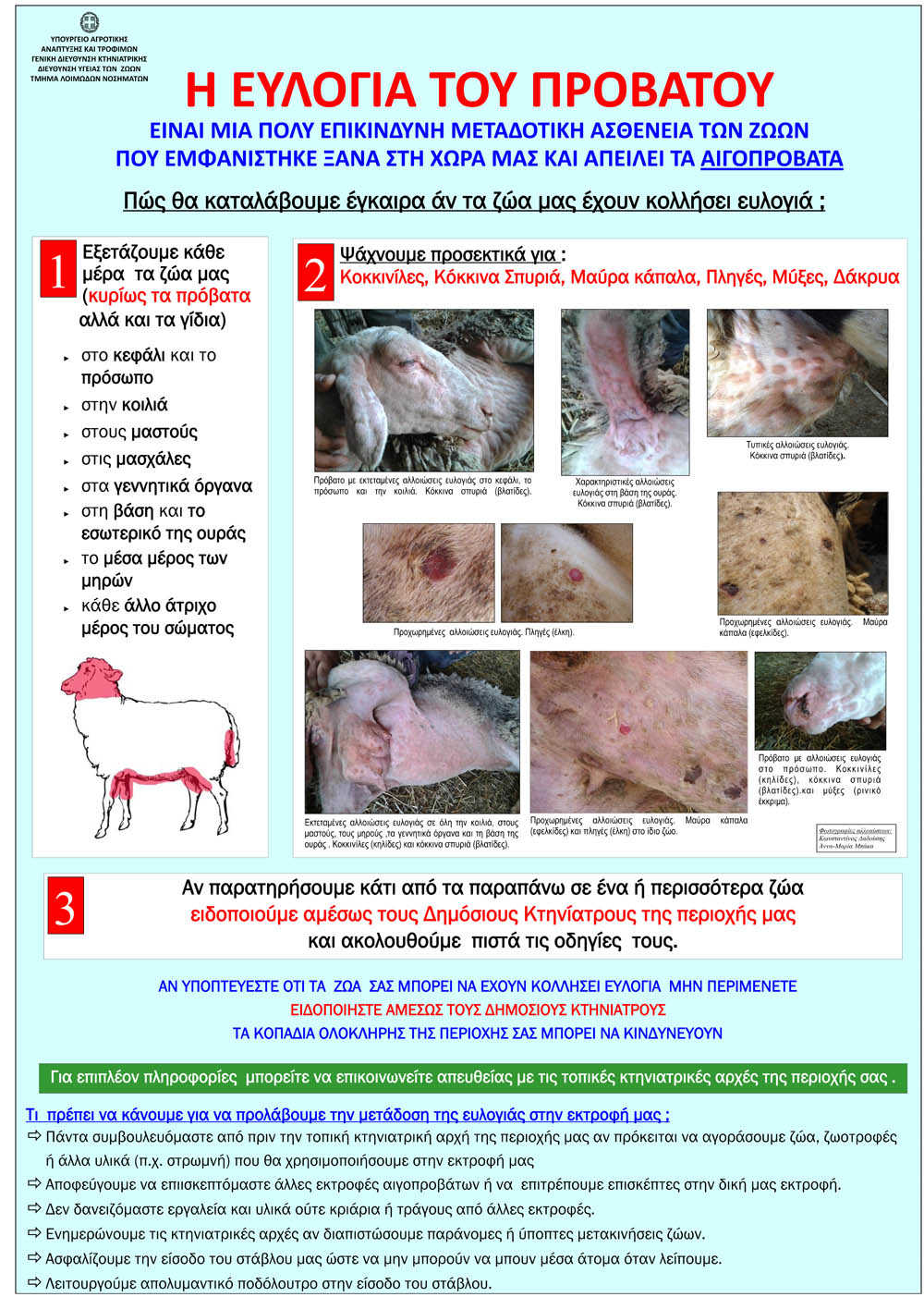 Για την αποτροπή εισόδου της ευλογιάς στην ηπειρωτική χώρα, αλλά και για την έγκαιρη διάγνωσή του, απαιτείται αυξημένη επαγρύπνηση και συνεργασία με τους κτηνιάτρους της υπηρεσίας μας.