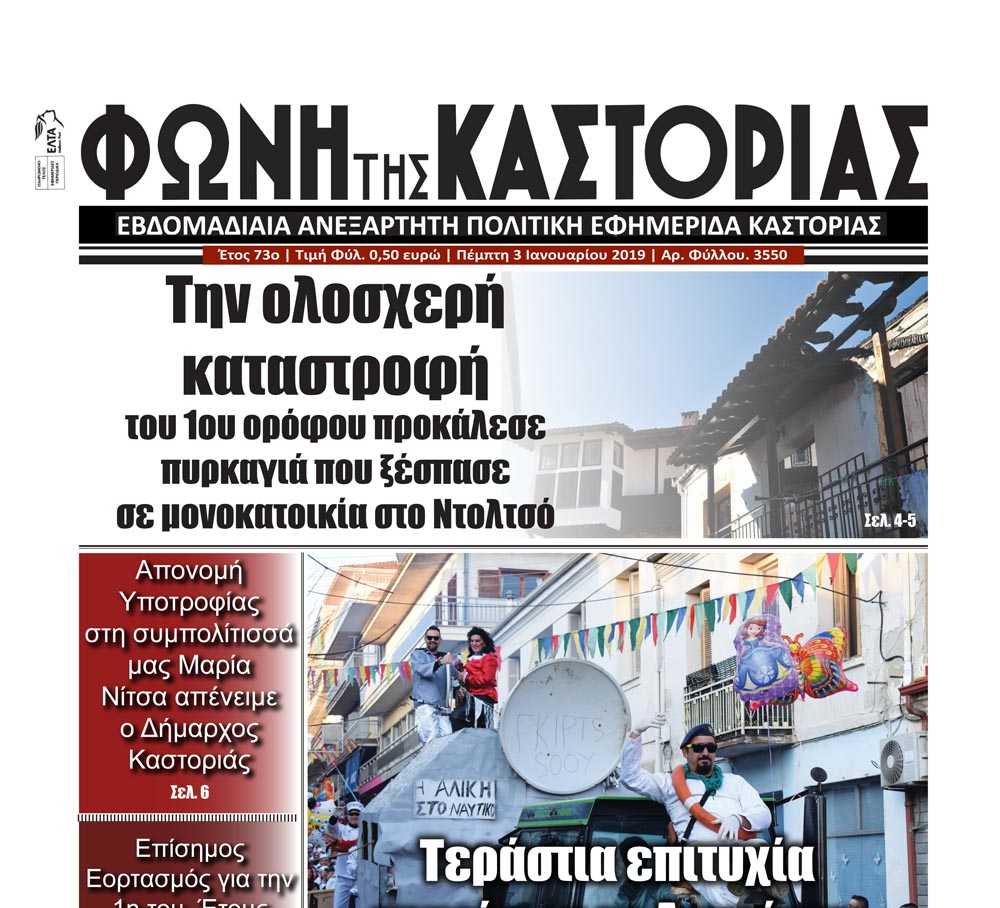 Το πρωτοσέλιδο της εφημερίδας μας “ΦΩΝΗ ΤΗΣ ΚΑΣΤΟΡΙΑΣ” | 3 / 1 / 19