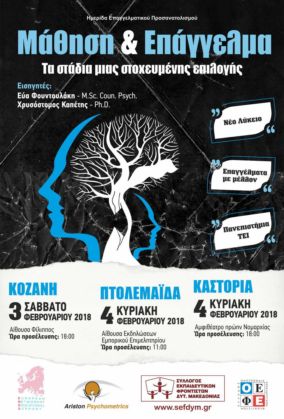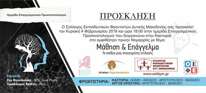 Ο Σύλλογος Εκπαιδευτικών Φροντιστών Δυτικής Μακεδονίας, ξεκινάει τον πρώτο κύκλο ενημερωτικών εκδηλώσεων για το 2018, με τίτλο: «Μάθηση και επάγγελμα – τα στάδια μιας στοχευμένης επιλογής».