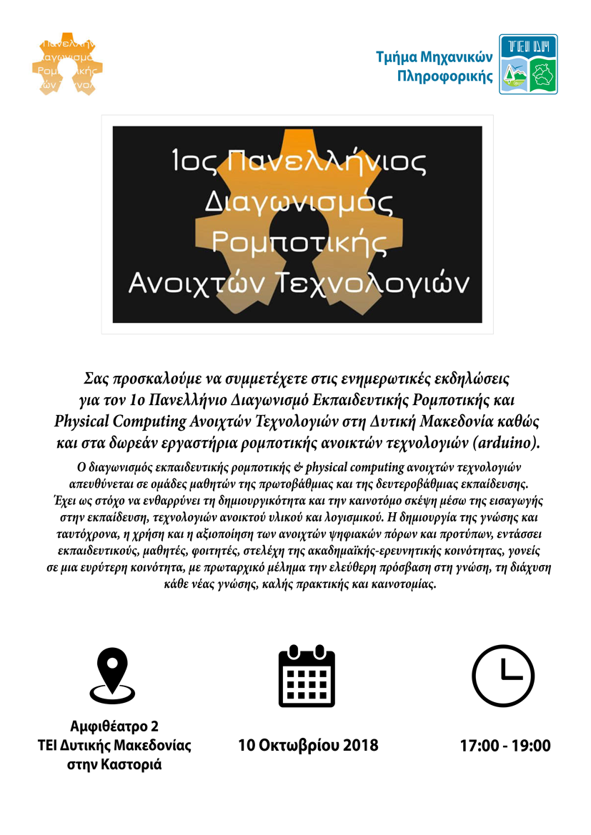 Η οργανωτική επιτροπή της Περιφέρειας της Δυτικής Μακεδονίας θα πραγματοποιήσει την Τετάρτη 10 Οκτωβρίου από τις 17:00 έως τις 19:00, ενημερωτική εκδήλωση για τον Διαγωνισμό Ρομποτικής μαζί με εργαστήριο (arduino) στο Αμφιθέατρο 2 του ΤΕΙ Δυτικής Μακεδονίας στην Καστοριά, με συντονιστή της εκδήλωσης τον κ. Άγγελο Μιχάλα, καθηγητή του τμήματος Μηχανικών Πληροφορικής του ΤΕΙ Δυτικής Μακεδονίας.