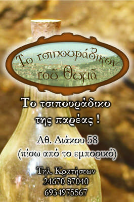 Κάθε Παρασκευή βράδυ μαζί με το διπλοβρασμένο τσίπουρο και τους εκλεκτούς μεζέδες, έχετε την δυνατότητα να γλεντήσετε στο Τσιπουράδικο με τους Νίκο Γαβριά στο βιολί, Ζέζιο Θεόδωρο στο τρίχορδο, και τον Γιώργο στην κιθάρα-τραγούδι, που θα παίζουν για εσάς τραγούδια Έντεχνα, Ρεμπέτικα και Παραδοσιακα.