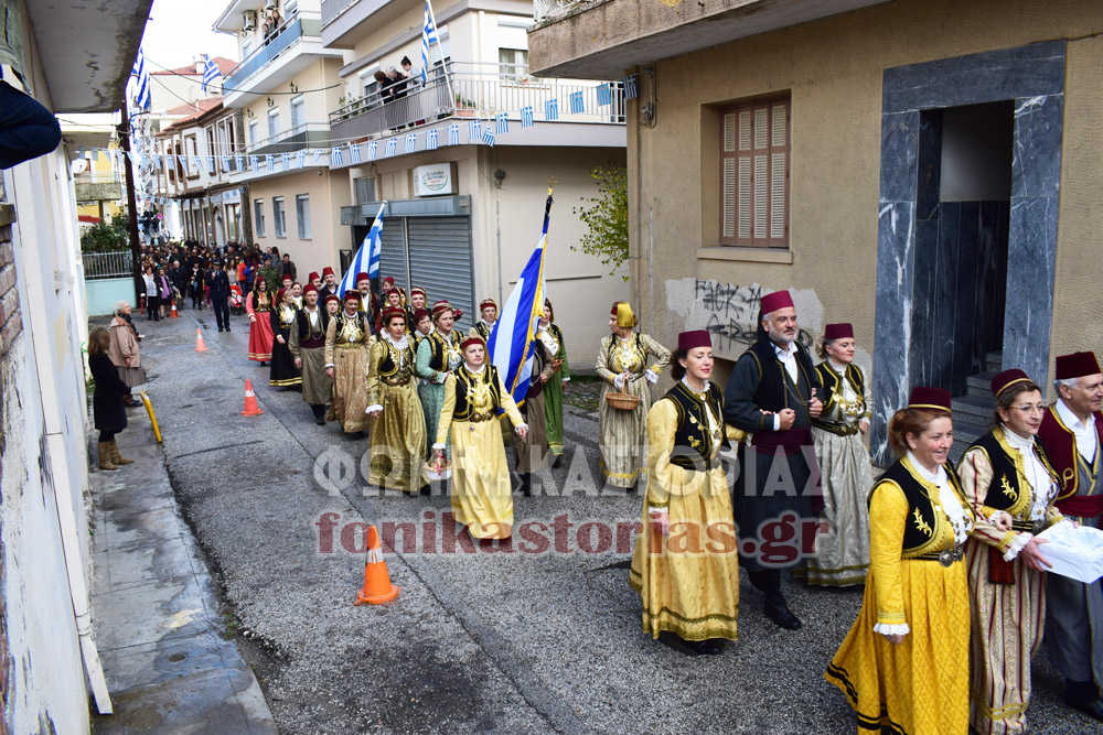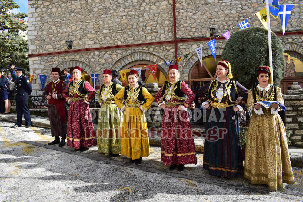 Οι στρατιώτες (προερχόμενοι απο το 585ΤΠ και 574ΤΠ Άργπυς Ορεστικού) και οι τρείς καβαλάρηδες (πολίτες ντυμένοι με στρατιωτικό ιματισμό), συνοδεία της Φιλαρμονής του Δήμου μας, διέσχυσαν την σημαιοστολισμένη οδό Μητροπόλεως, από το ύψος του παλιού δημαρχείου και κατευθύνθηκαν, δια μέσω της οδού Μανωλάκη, στην Ι. Μητρόπολη Καστοριάς, όπου τους υποδέχτηκαν, ο Σεβ. Μητροπολίτης μας, Κλήρος και Λαός.