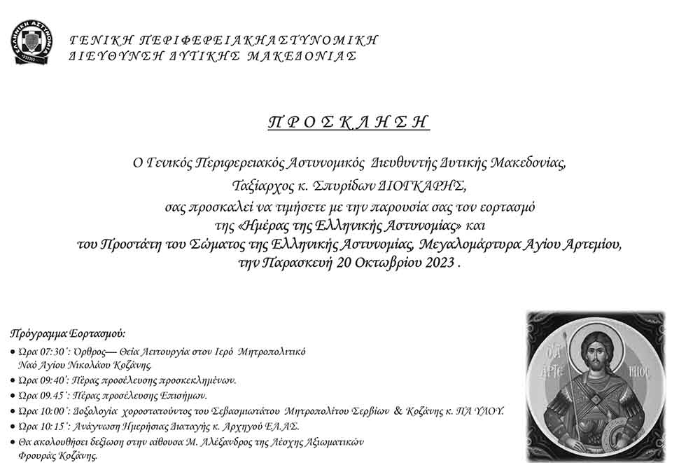 Γεν. Περιφ. Αστυνομική Δ/νση Δυτ. Μακεδονίας: Εορτασμός του Προστάτη του Σώματος, Μεγαλομάρτυρα Αγίου Αρτεμίου και της «Ημέρας της Ελληνικής Αστυνομίας»