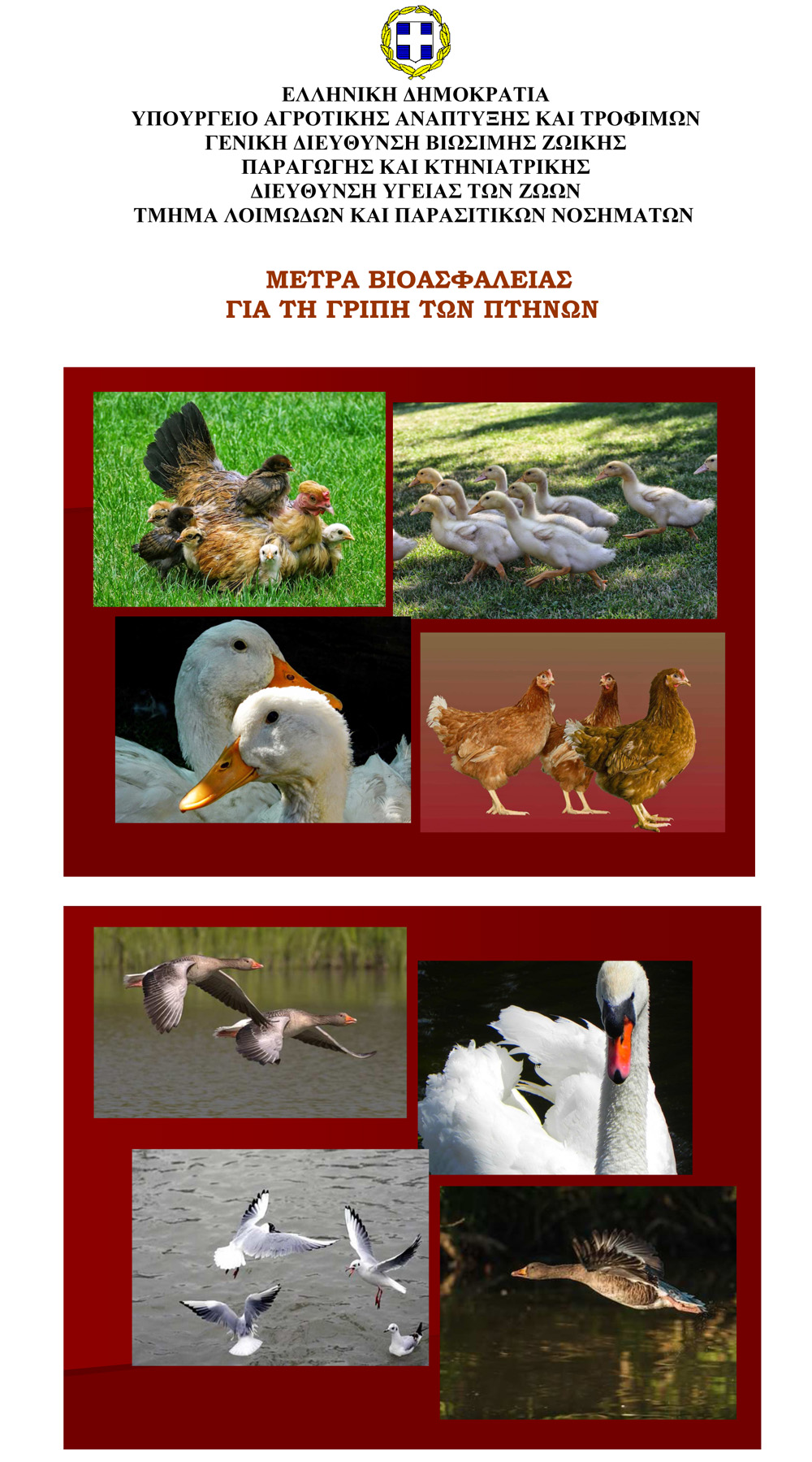Συνημμένως, αποστέλλεται έντυπο οδηγιών με τα μέτρα βιοασφάλειας που πρέπει να εφαρμόζονται στις εκτροφές πουλερικών (οικόσιτες & συστηματικές), για την αποφυγή μετάδοσης του ιού από τα άγρια πτηνά στα εκτρεφόμενα. Το συγκεκριμένο έντυπο οδηγιών έχει αναρτηθεί στην ιστοσελίδα του Υπουργείου Αγροτικής Ανάπτυξης και Τροφίμων (www.minagric.gr).