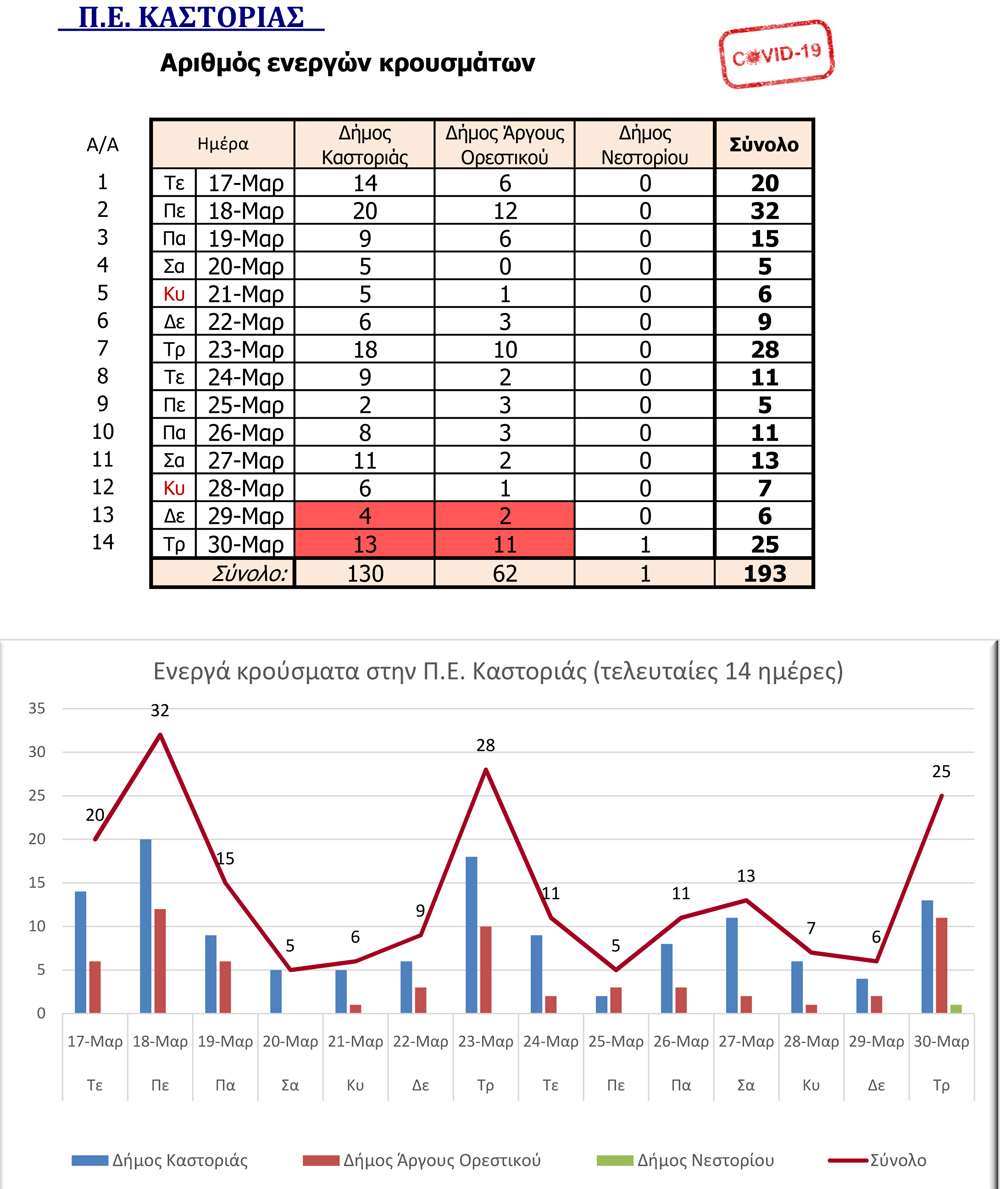 Η Περιφέρεια Δυτικής Μακεδονίας στα πλαίσια της ενημέρωσης για την  εξέλιξη των κρουσμάτων κορωνοϊού, δίνει στη δημοσιότητα σχετικό πίνακα στον οποίο αποτυπώνεται ο αριθμός των ενεργών κρουσμάτων κατά Περιφερειακή Ενότητα.