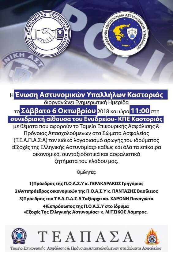 Ημερίδα της Ένωσης Αστυνομικών Υπαλλήλων Καστοριάς – Σάββατο 6/10