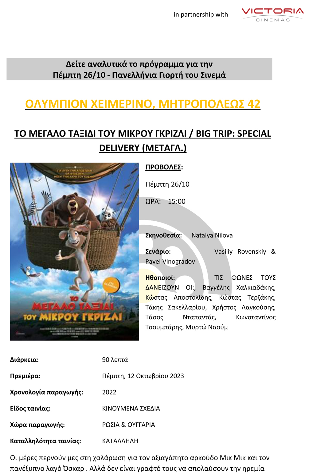 Η ΓΙΟΡΤΗ ΤΟΥ ΣΙΝΕΜΑ έρχεται και στην πόλη μας την Καστοριά οπού θα μπορέσετε με 2€ να απολαύσετε οποιαδήποτε ταινία στον κινηματογράφο ΟΛΥΜΠΙΟΝ μέσα από το πλούσιο πρόγραμμα, ειδικά διαμορφωμένο για την ημέρα αυτή!