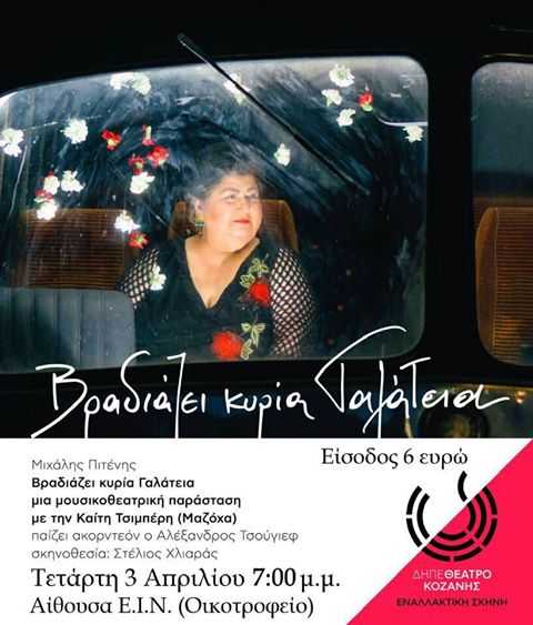 Ο Πολιτιστικός Σύλλογος Νεστορίου σας προσκαλεί στην θεατρική παράσταση «Βραδιάζει κυρία Γαλάτεια» η οποία έρχεται για πρώτη φορά στον νομό μας φέτος. Την Τετάστη 3/4/2019 και ώρα 7:00μ.μ. στην αίθουσα του Ε.Ι.Ν. στο Νεστόριο.
