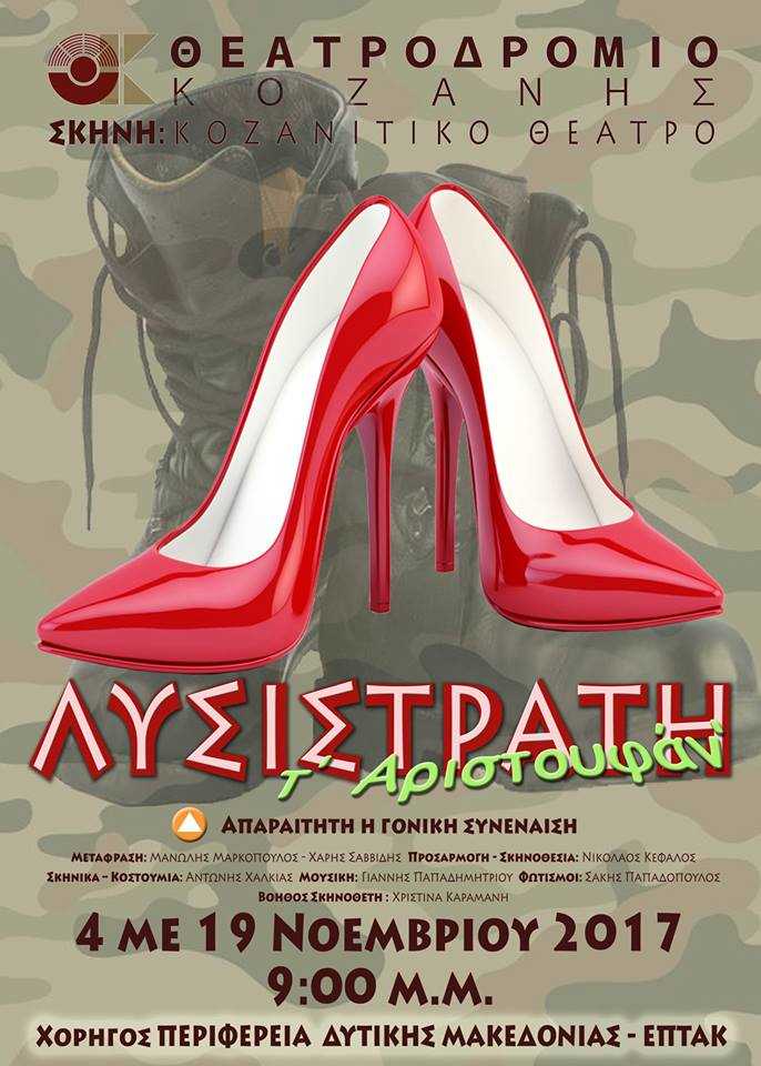Το Θεατροδρόμιο Κοζάνης αναβιώνοντας την “Κοζανίτικη Σκηνή” του , ανεβάζει την Λυσιστράτη του Αριστοφάνη στο Κοζανίτικο ιδίωμα! Μια πρόκληση για μας και μια πρόσκληση σ’ ένα θεατρόφιλο κοινό που προσδοκά πάντα να παρακολουθεί ποιοτικές παραγωγές. Μια παράσταση που αναδεικνύει τον Αριστοφανικό λόγο δοσμένο αριστοφανικά μέσα από το κοζανίτικο ιδίωμα και το καυστικό κοζανίτικο χιούμορ!