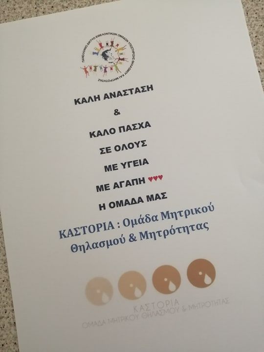 Στο πλαίσιο της πανδημίας του κορωνοϊού που πλήττει ευπαθείς ομάδες στην Ελλάδα και δη στην Καστοριά, η Ομάδα Μητρικού Θηλασμού και Μητρότητας Καστοριάς, προχώρησε σε μία δωρεά εν όψει των Άγιων Ημερών του Πάσχα. Τη Μ. Δευτέρα 13 Απριλίου 2020 φροντίσαμε να παραδοθούν τρόφιμα, απορρυπαντικά και είδη προσωπική υγιεινής προς το Γηροκομείο Καστοριάς με τις θερμότερες ευχές όλων των μελών της ομάδας μας για Καλό Πάσχα και Καλή Ανάσταση!