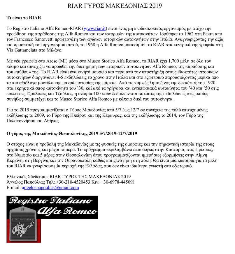 Σύμφωνα με το πρόγραμμα του διοργανωτή (R.I.A.R. – Registero Italiano Alfa Romeo – www.riar.it) ο σκοπός της περιήγησης είναι η προβολή των ιστορικών τους οχημάτων μέσα από τις ομορφιές της Ελλάδας. Ο Ελληνικός σύνδεσμος RIAR επέλεξε την πλατεία Ντολτσό στην παραδοσιακή συνοικία της Καστοριάς το Σάββατο 6 Ιουλίου 2019 από τις 15:30 έως τις 18:00, ώστε τα αυτοκίνητα να σταθμεύσουν και να μπορέσουν όσοι επιθυμούν να τα θαυμάσουν αλλά και να τα φωτογραφήσουν από κοντά.