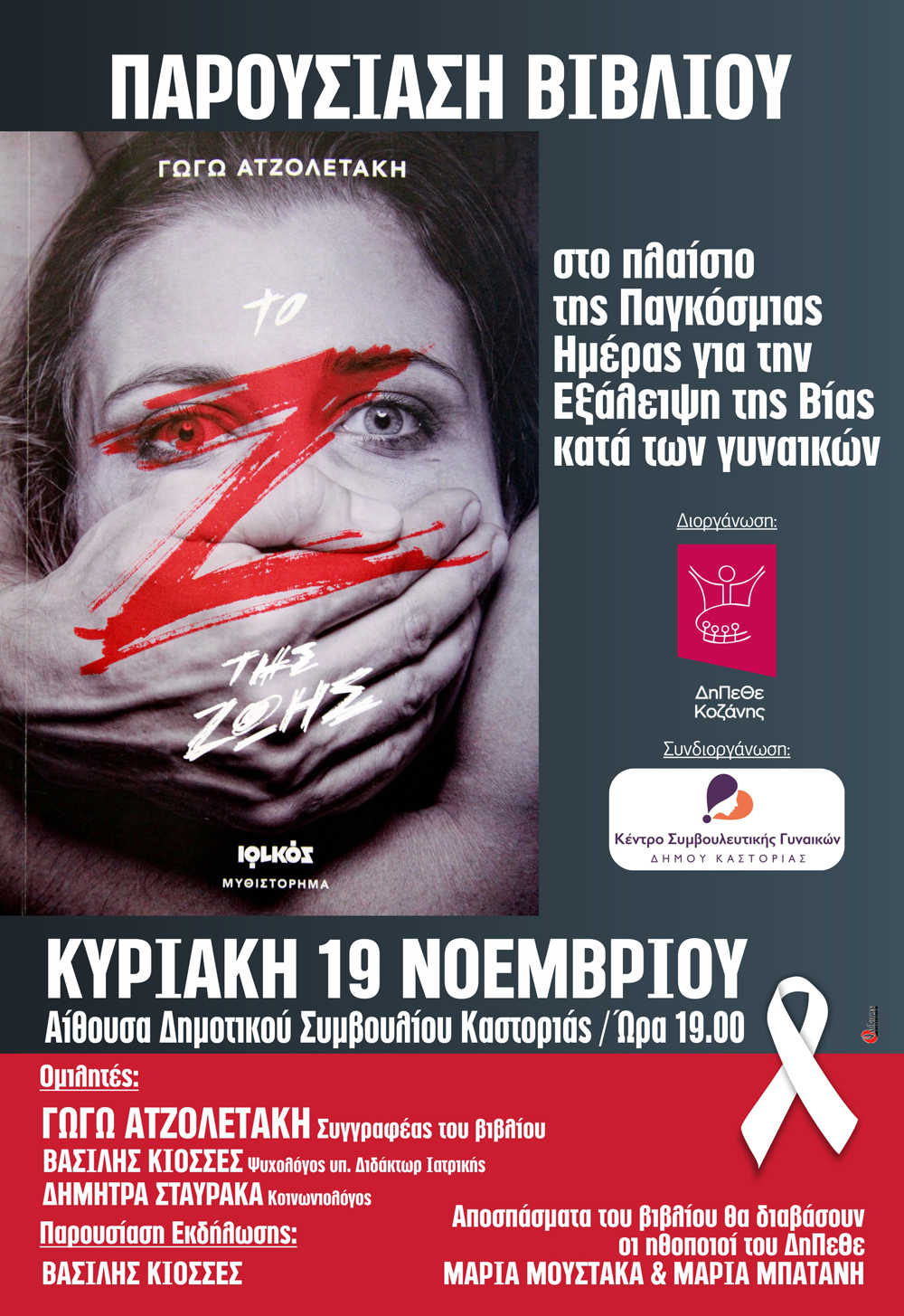 Το Κέντρο Συμβουλευτικής Γυναικών του Δήμου Καστοριάς και ο Δήμος Καστοριάς σε συνεργασία με το ΔΗ.ΠΕ.ΘΕ. Κοζάνης, με αφορμή τη Διεθνή Ημέρα για την Εξάλειψη της Βίας κατά των Γυναικών σας προσκαλούν την Κυριακή 19 Νοεμβρίου 2017 και ώρα 19.00 στην παρουσίαση του βιβλίου «Το Ζ της Ζωής» της Γωγώς Ατζολετάκη που θα γίνει στην αίθουσα δημοτικού συμβουλίου Καστοριάς.