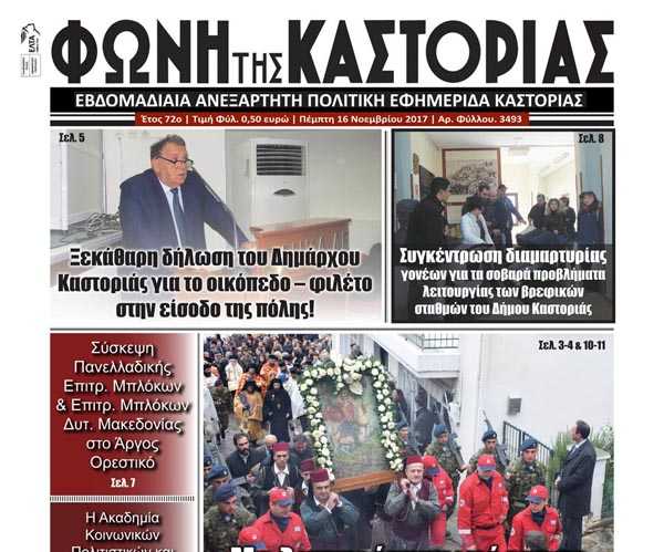 Το πρωτοσέλιδο της εφημερίδας μας “ΦΩΝΗ ΤΗΣ ΚΑΣΤΟΡΙΑΣ” | 16 / 11 / 17