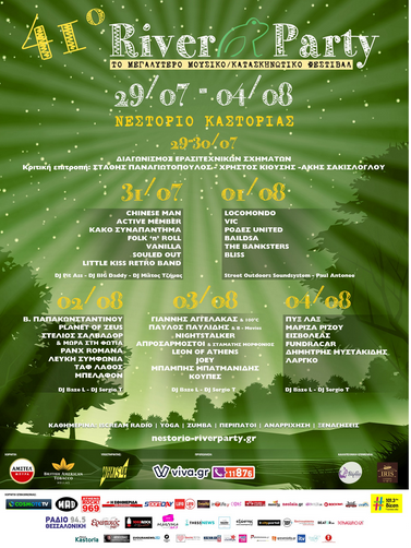 Η επένδυση στις υποδομές, η προσεκτική επιλογή του line-up, ο σεβασμός στο μυστικιστικό τοπίο του ποταμού, οι τρεις ανανεωμένες σκηνές, οι περισσότεροι από 60 καλλιτέχνες και οι χαμηλές τιμές είναι μερικοί μόνο από τους λόγους που κι εσύ δεν πρέπει να χάσεις το 41ο River Party, το μεγαλύτερο και μακροβιότερο μουσικό, κατασκηνωτικό φεστιβάλ στην Ελλάδα ενώ φέτος για πρώτη φορά #rivergoesgreen με το πρόγραμμα ανακύκλωσης Κάθε Κουτί Μετράει. Βρες τους «πράκτορες» με τα backpacks του Κάθε Κουτί Μετράει, ανακύκλωσε κι εσύ τα κουτάκια μπύρας και αναψυκτικών και κέρδισε τα πιο cool δώρα.