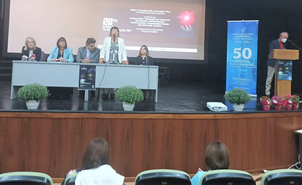 Πρόκειται για την εκδήλωση «Ο 20ος αιώνας και τα επιτεύγματα του», με ομιλητές τους Τζηκαλάγια Ζήση, Γιατρό Πνευμονολόγο και Βουλευτή Καστοριάς, την Δέσποινα Κοζατσάνη, Γιατρό Καρδιολόγο και Αντιπεριφερειάρχη Καστοριάς, την Γιατρό Ογκολόγο-Ειδική Παθολόγο Σοφία Μπάκα και την Βασιλική Μπούκλα Παπαγεωργίου Συνταξιούχο Εκπαιδευτικό, η οποία είχε την πρωτοβουλία της εκδήλωσης, συντονίστρια της οποίας ήταν η Γ. Γραμματέας του συλλόγου Μαυρίδου Δήμητρα.