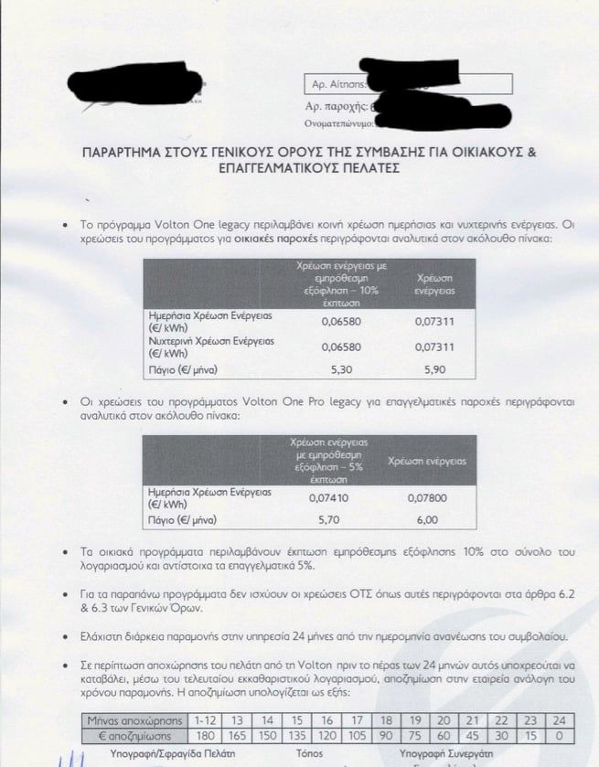 Πολίτης με 24μηνο συμβόλαιο σταθερής χρέωσης ενέργειας στα €0,07311/kwh ή €0,0658/kwh σε εμπρόθεσμη πληρωμή, χωρίς ρήτρα αναπροσαρμογής, (σε περίπτωση αποχώρησής του μάλιστα από την εταιρεία θα κατέβαλλε αποζημίωση για μη τήρηση συμφωνηθέντων!) είδε στον εκκαθαριστικό λογαριασμό στις 10/11/2021 να αλλάζουν μονομερώς το συμβόλαιο και να του χρεώνουν €0,09218/kwh (αύξηση 26%) και στη συνέχεια στον εκκαθαριστικό λογαριασμό στις 04/03/2022 να του χρεώνουν €0,178/kwh (αύξηση 139%).