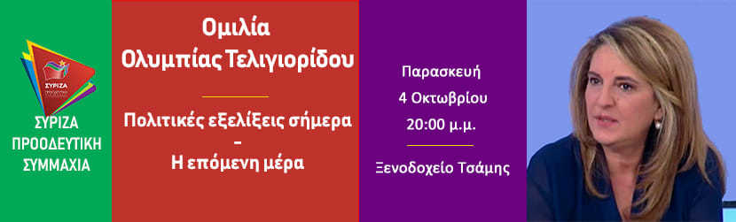 Ομιλία Ολυμπίας Τελιγιορίδου στις 4 Οκτωβρίου στο Ξενοδοχείο “ΤΣΑΜΗΣ”