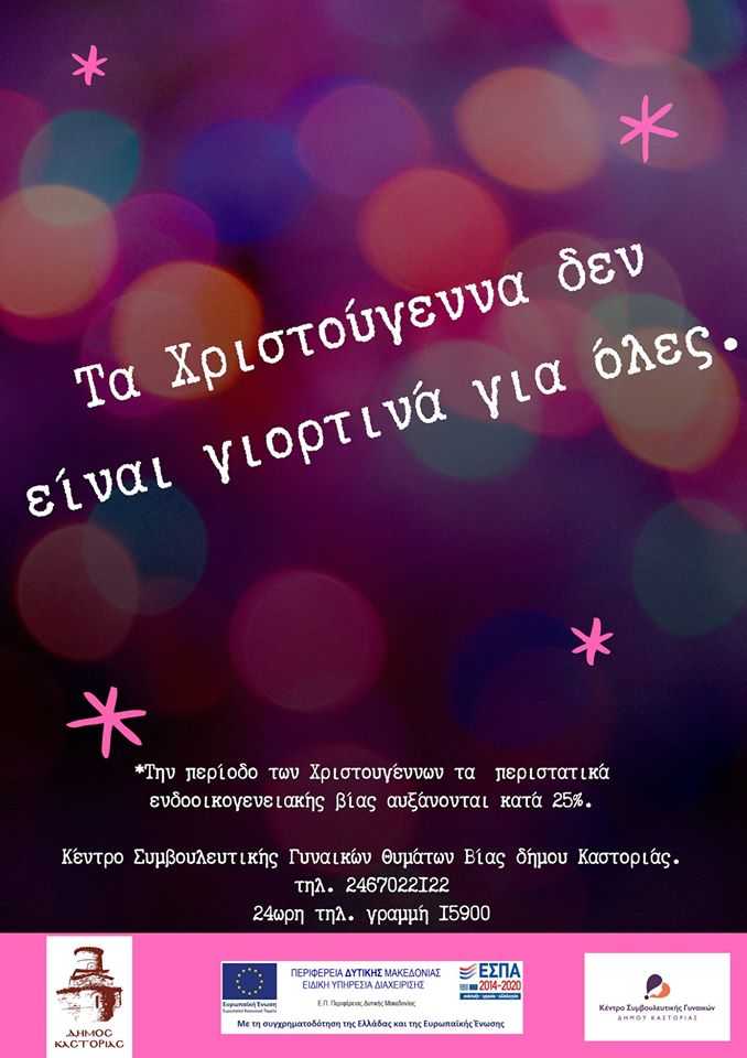 Ο Σύλλογος καταστημάτων υγειονομικού ενδιαφέροντος Καστοριάς, εκφράζει την στήριξη του στο κέντρο συμβουλευτικής γυναικών θυμάτων βίας δήμου Καστοριάς και βοηθάει στην προώθηση της νέας καμπάνιας για τις μέρες των Χριστουγέννων.