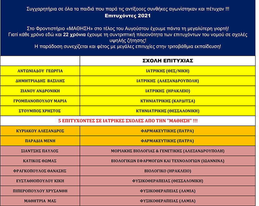ΠΑΝΕΛΛΑΔΙΚΕΣ 2021 – Επιτυχόντες Φροντιστηρίου “ΜΑΘΗΣΗ”